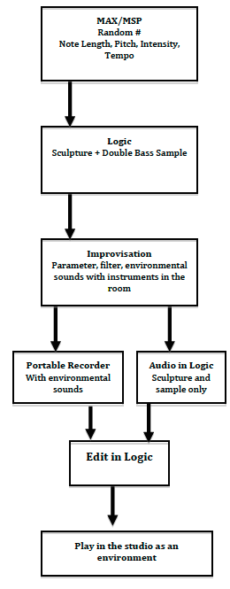 Through internal MIDI, the random numbers generated in Max/MSP were sent to Sculpture, the physical modeling synthesizer in Logic. A double bass sampling was used as another instrument to infuse the essence of free jazz, which is my impression of Pam’s painting and of Harlem, where she grew up. While Sculpture was generating random pitches, I improvised using the parameters and filters of the synthesizer. All randomized numbers were set 1–128, so there are a lot of impossible leaps. I could hear this as sounds existing in nature (unintentional sounds) so I tried to modify the color (timbre) of the algorithmic succession of the notes.